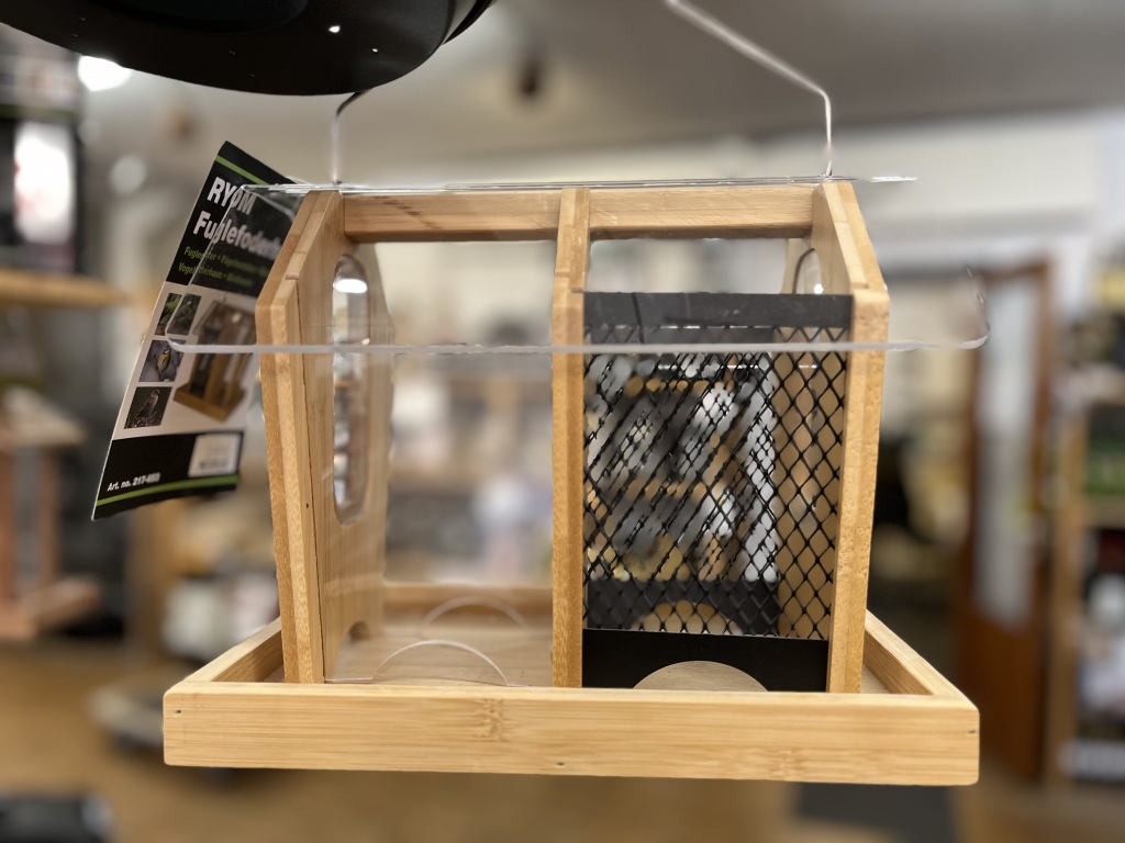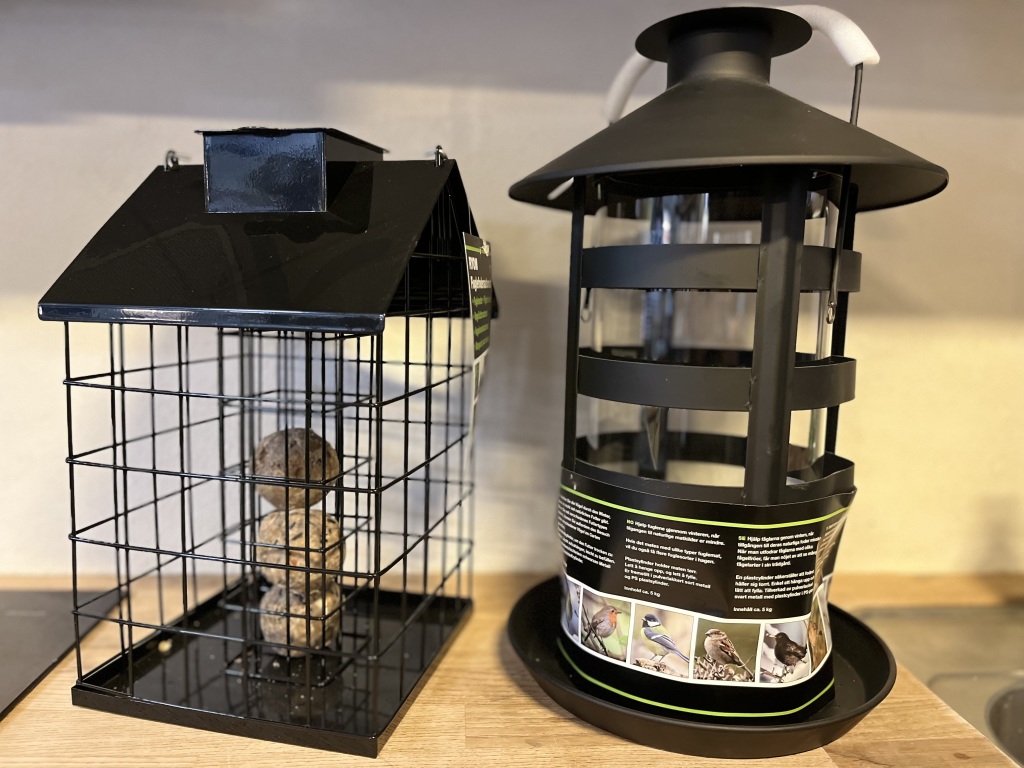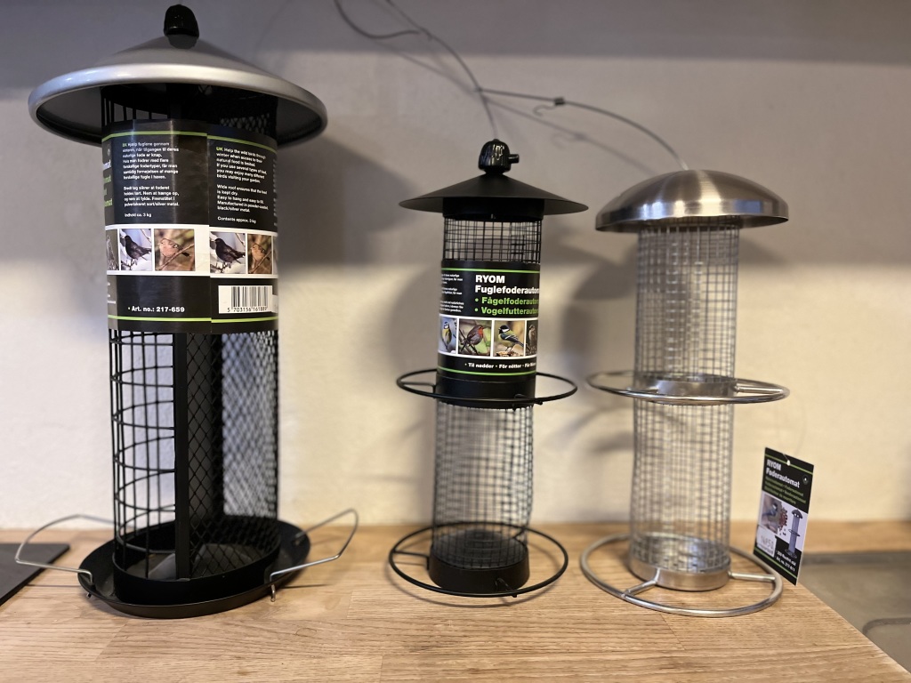 - Frø og mejsebolde, standard med og uden net, og luksenøddebolde, til havens fugle samt ophæng til foder